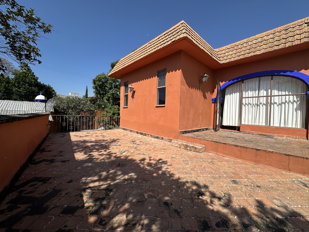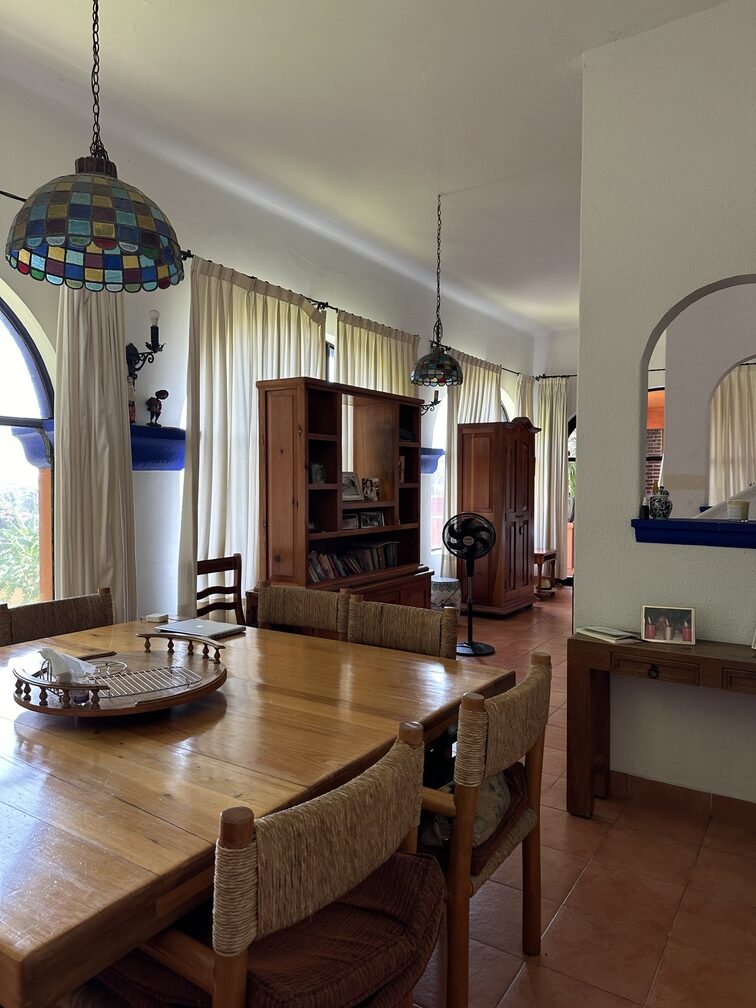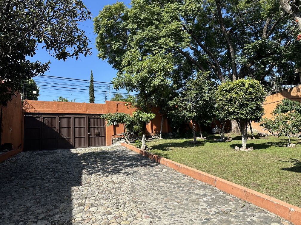 Casa principal estacionamiento hasta para 9 autos, jardín con árboles frutales y de sombra. Dos niveles con estancia y comedor vista hacia los jardines y alberca, cocina integral equipada con altos techos