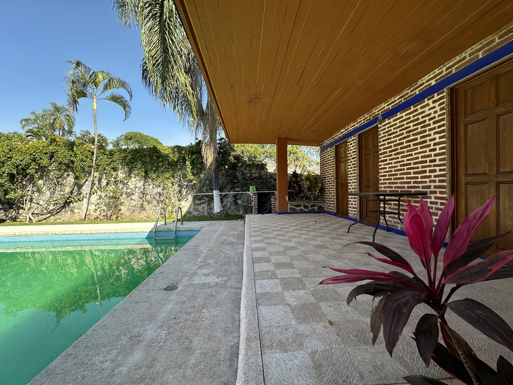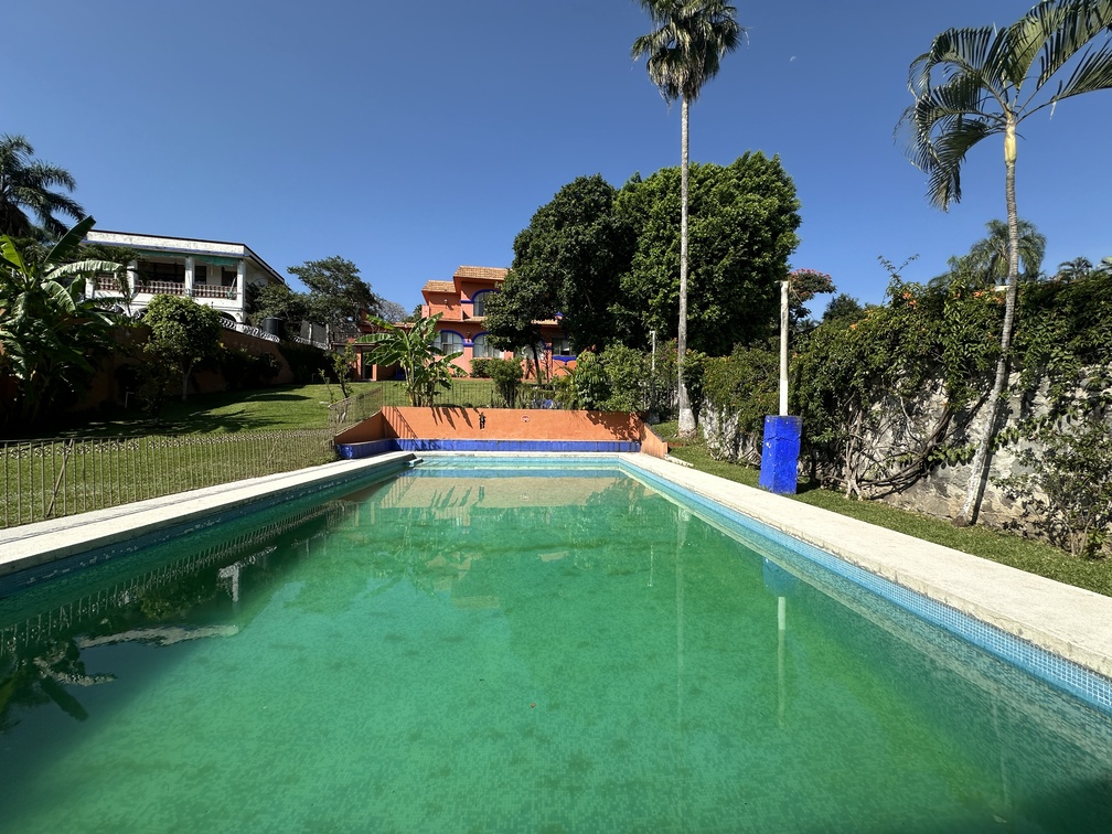 Grandes jardínes con pequeño desnivel, alberca con terrazas y vestidores. Area para preparación de alimentos
